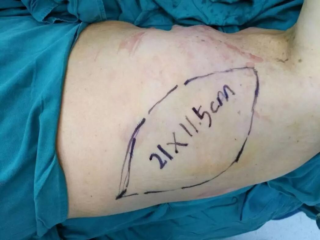 5月20日,乳甲外科团队术前精心为李奶奶设计了背阔肌肌皮瓣用于修复乳腺癌改良根治后皮肤缺损,历时3个小时后成功实施了手术,术中游离背阔肌肌皮瓣移植术,皮瓣面积达21cm×11.5cm,术后密切监测患者的皮温及血运,恢复顺利,现皮瓣已成活,医患双方对治疗效果均非常满意,该项技术在市内尚未见报道。