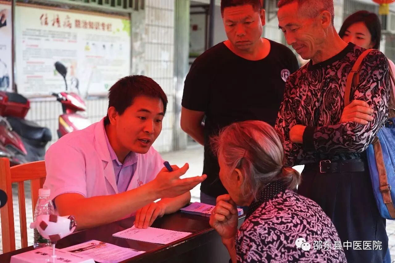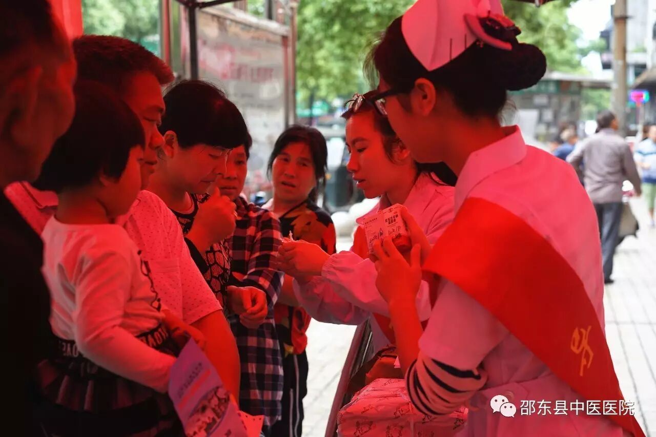 邵东县中医医院眼科护理人员正在向群众赠送药品