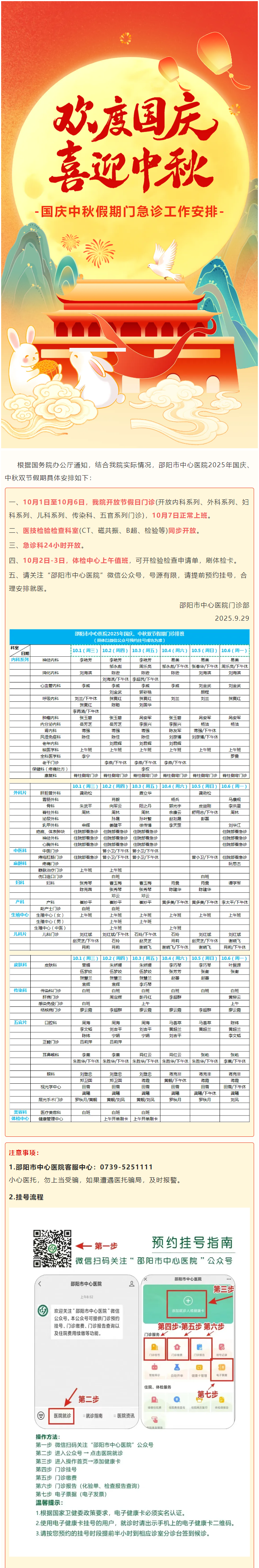 邵阳市中心医院2025年国庆、中秋节假期门急诊工作安排